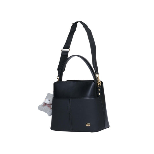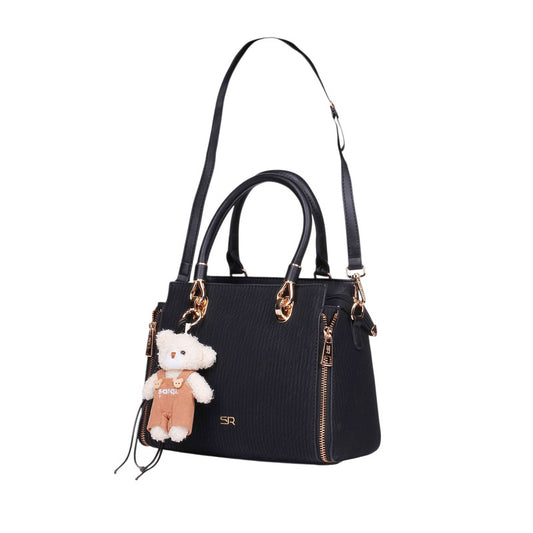 PU Leather Two-Tone Handbag with Teddy Charm – Black