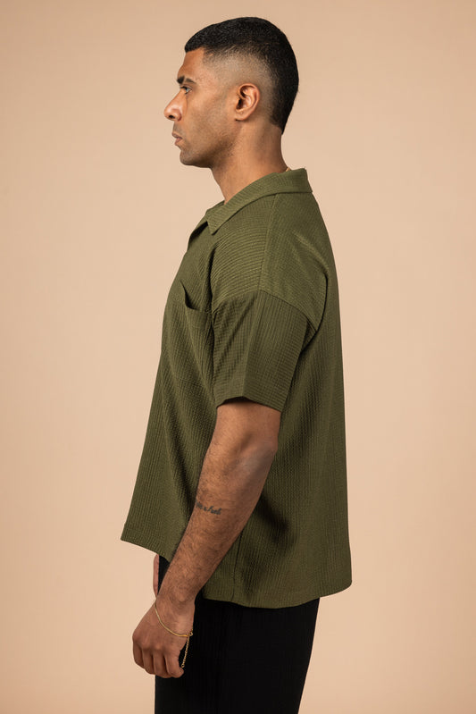 Cotton Moon Crushed Boxy Fit Polo Shirt - Olive Green
