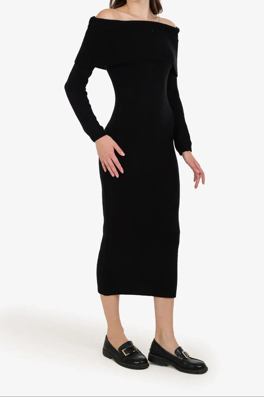 Polyester Plain Off-Shoulder Midi Dress – Black