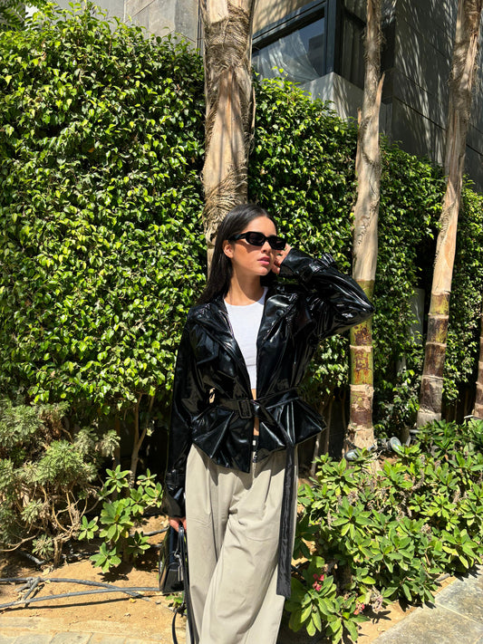 Faux Leather Solid Belted Jacket – Black