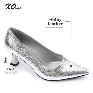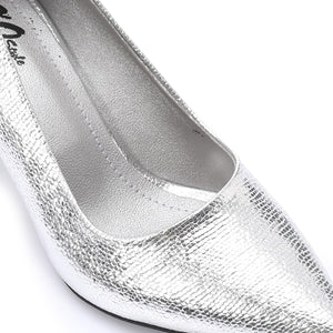 - Key Features: Shimmering metallic silver finish, textured surface for added style, elegant pointed toe, cushioned insole, sleek kitten heel for balance and comfort