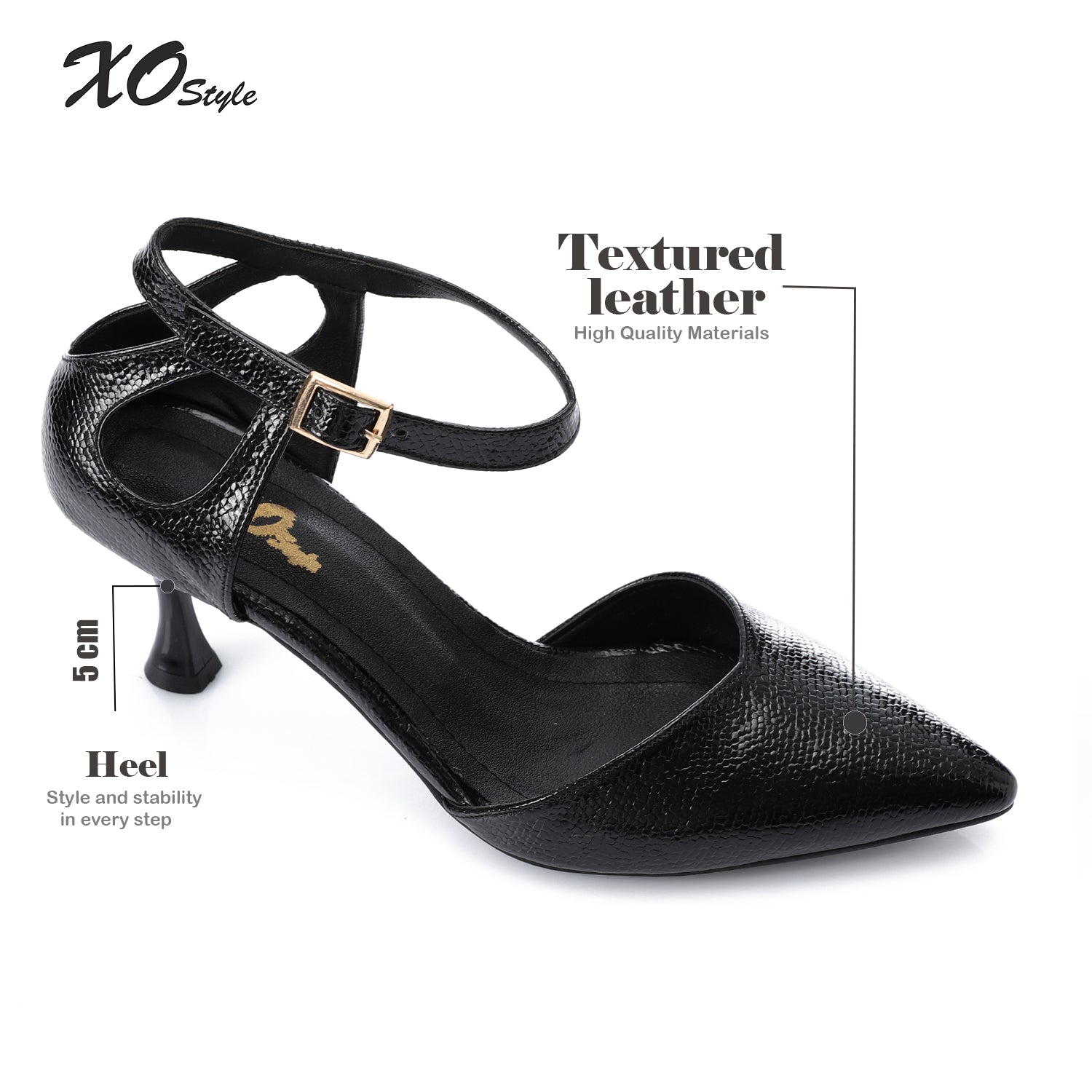 Key Features: Sleek pointed-toe silhouette, glossy textured finish, supportive ankle strap, stylish flared kitten heel