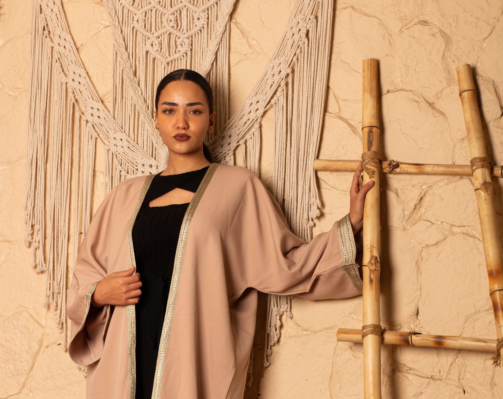 Features: Flowing silhouette with intricate gold embroidery along the edges.