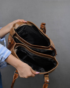 Leather Textured Glossy Accent Handbag – Brown