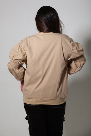 - Sleeves: Long puff sleeves with gathered elastic detailing at elbow
