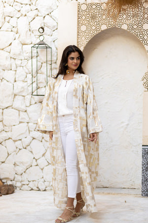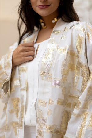 Linen & Brocade Geometric Kimono – White & Gold