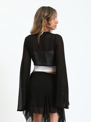 Chiffon Sheer Tie-Front Blouse - Black