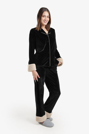 Plain Faux-Fur Trim Velvet Pajama Set – Black