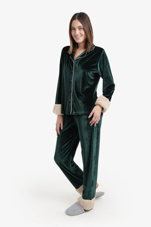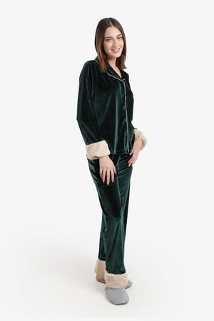 Plain Faux-Fur Trim Velvet Pajama Set – Olive Green