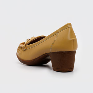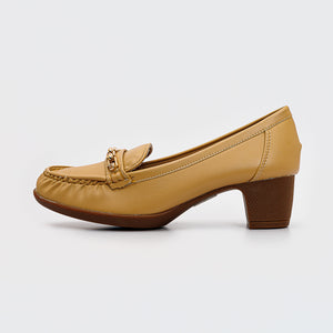 Upper: Beige with raised moccasin stitching and a loafer strap featuring a gold-toned buckle or chain detail
