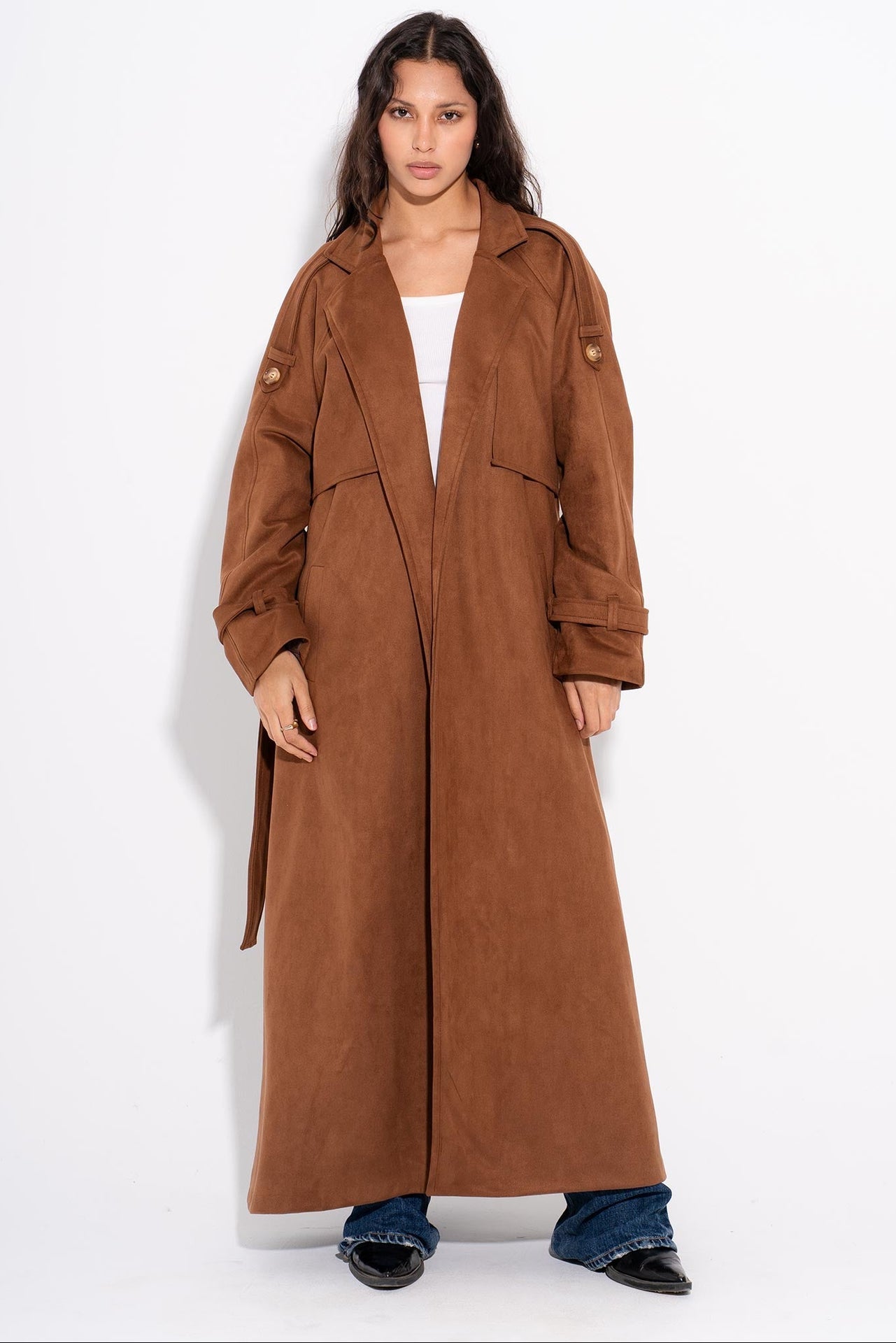 - Details: Luxurious suede texture with timeless trench styling and flowing maxi cut