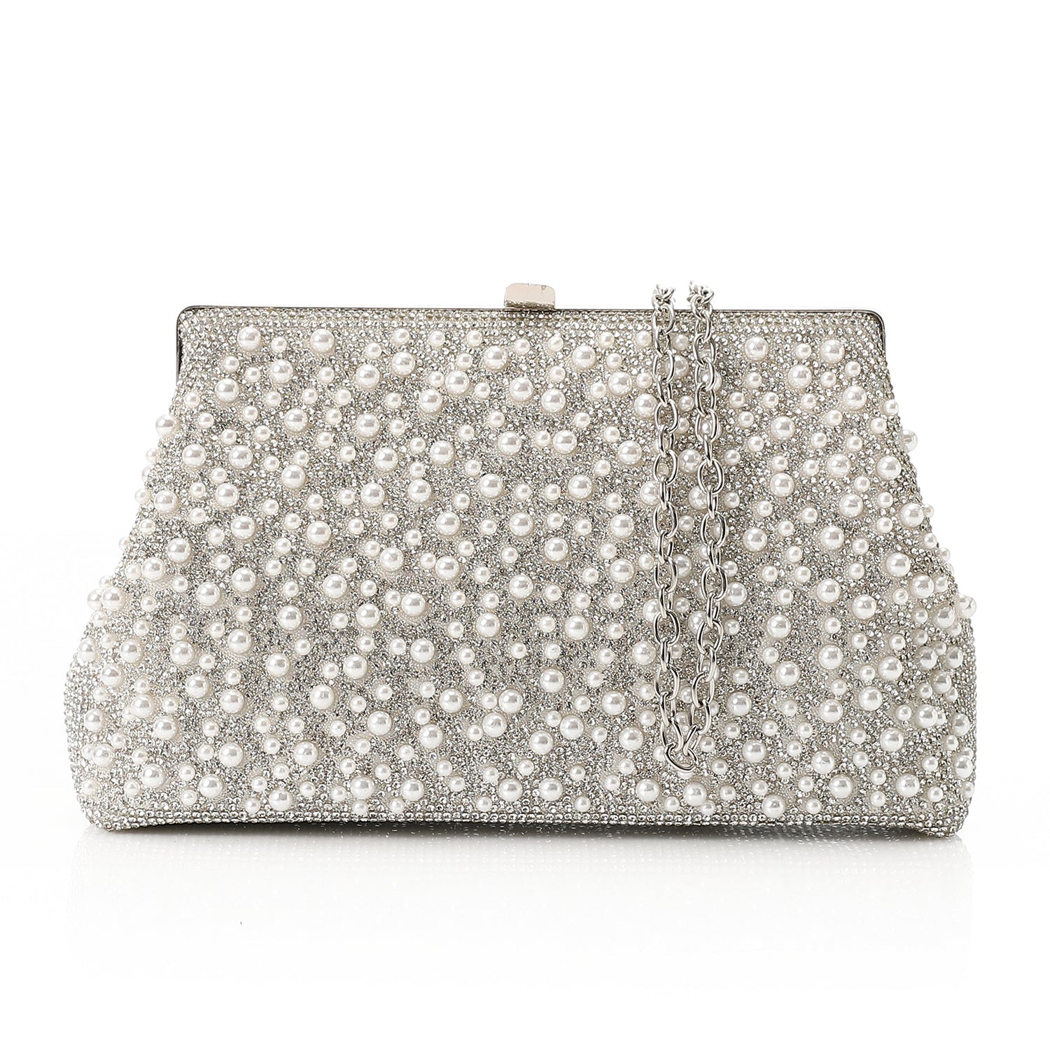 - Hardware / Details: Polished metal frame with all-over pearl and crystal embellishment