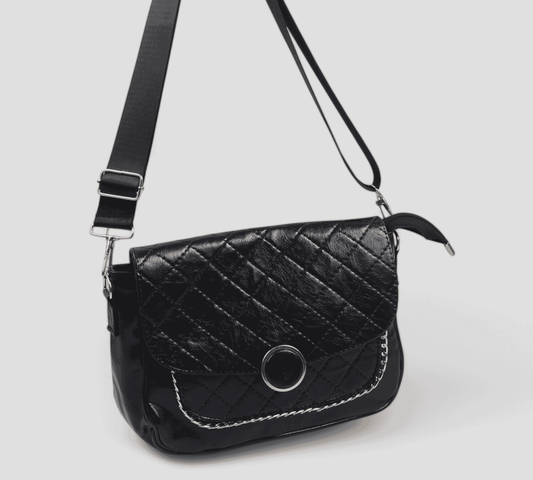 Faux Leather Saddle Crossbody Bag with Gold Chain Detail – Black