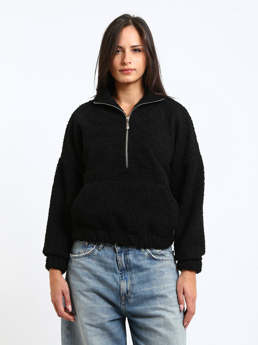 Teddy Fur Plain Half-Zip Sweatshirt – Black