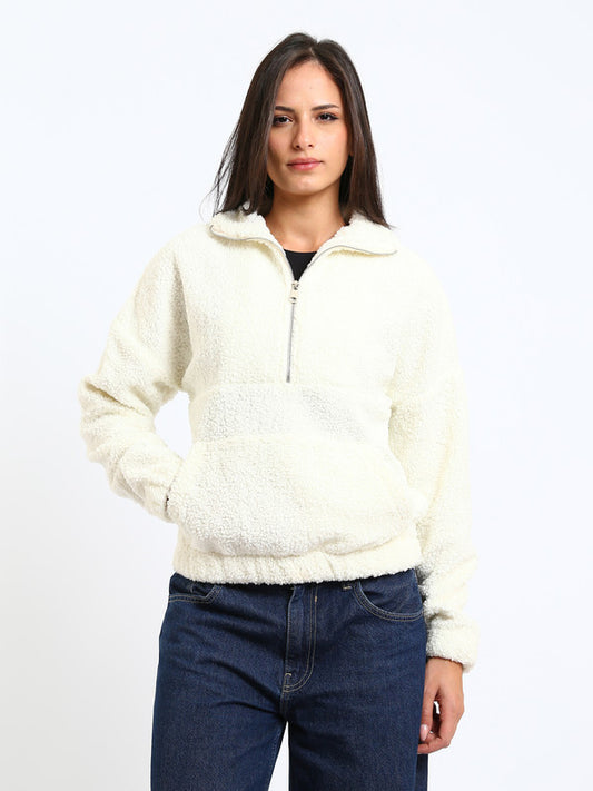 Teddy Fur Plain Half-Zip Sweatshirt – White