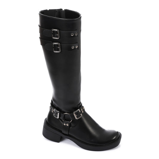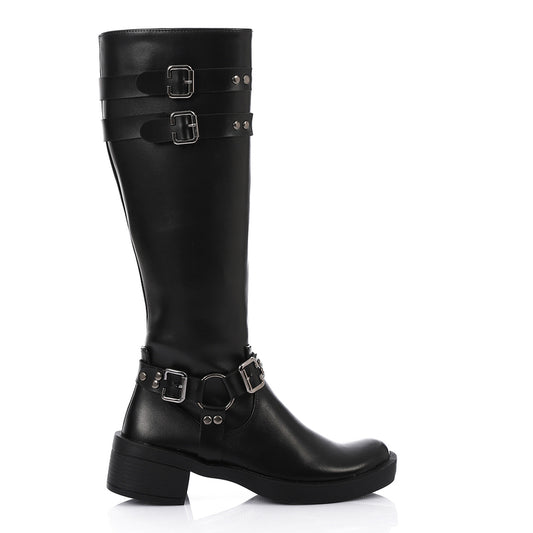 Faux Leather Buckle Detail Mid-Calf Boots - Brown