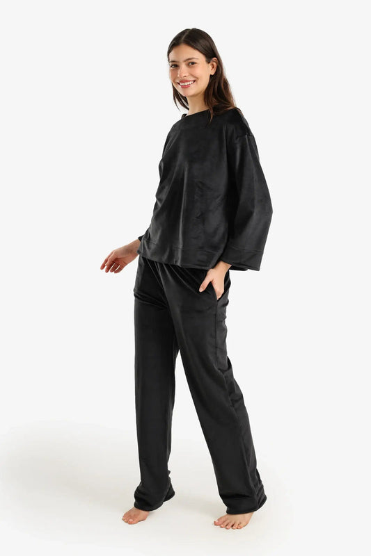Velvet Contrast-Trim Pajama Set – White & Light Grey