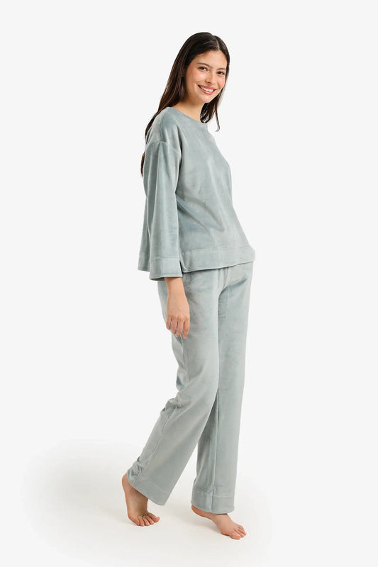 Velvet Contrast-Trim Pajama Set – White & Mint Green
