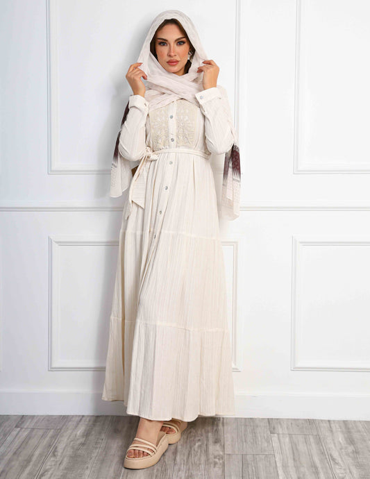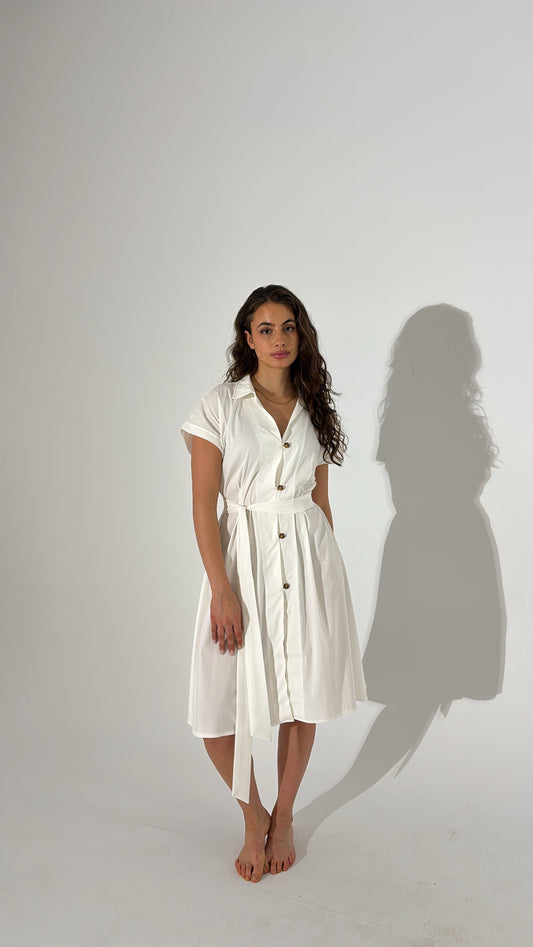Gabardine Waist-Pleated Button-Down Midi Dress - Beige
