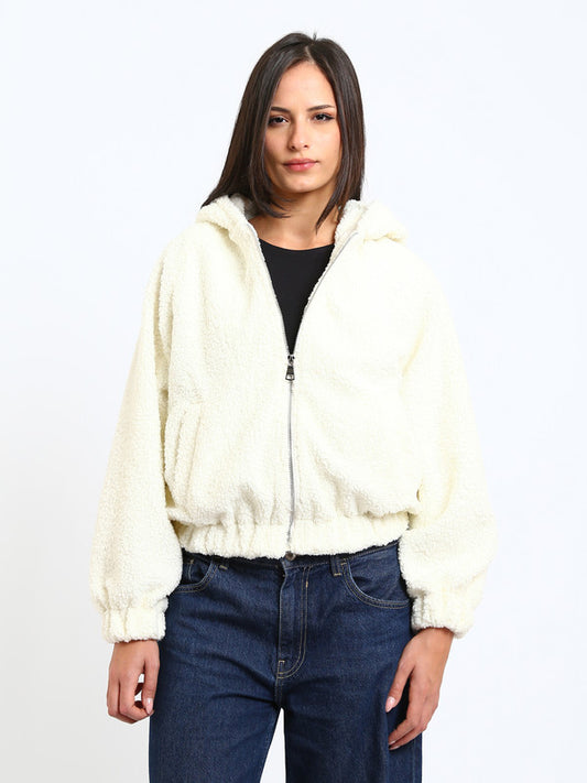 Teddy Fur Plain Hooded Jacket – White