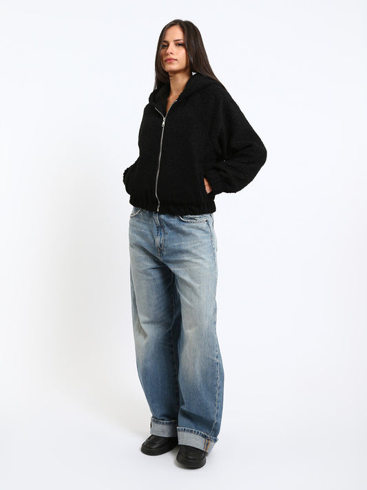 Teddy Fur Plain Hooded Jacket – Black