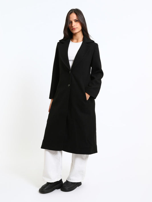Wool Blend Plain Two Button Long Coat – Black