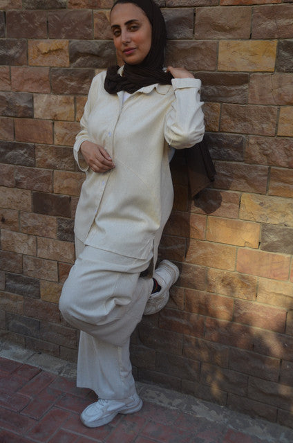 Linen Oversized Embroidered Two-Piece Set – Beige