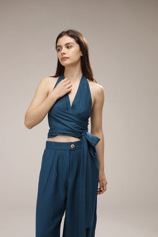 Linen Halter Wrap Top & Wide-Leg Pants Set - French Blue