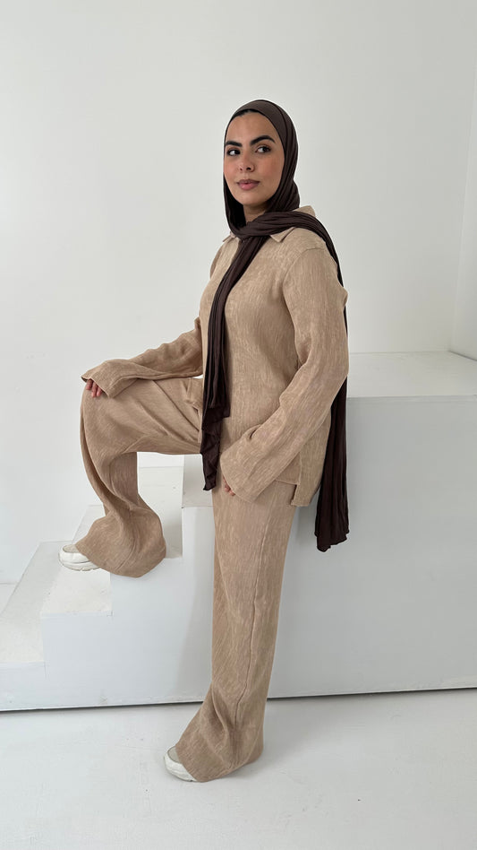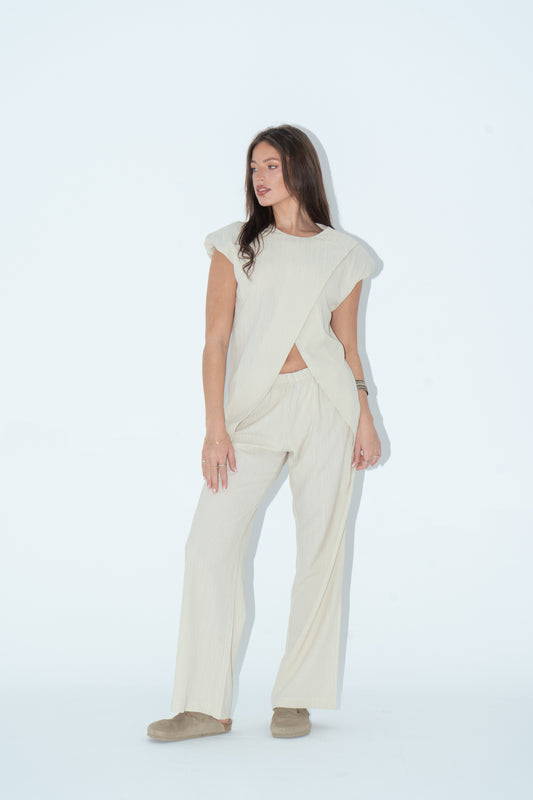 Linen Button-Front Vest & Wide-Leg Pants Set - Beige