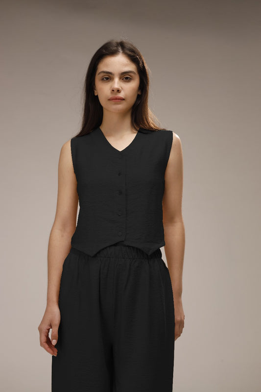 Linen Button-Front Vest & Wide-Leg Pants Set - Black