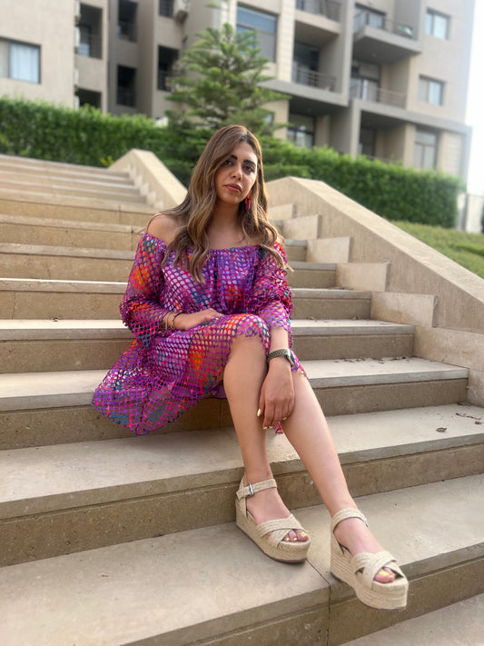 Fishnet Off Shoulder Long Sleeve & Short Skirt Set - Multicolor