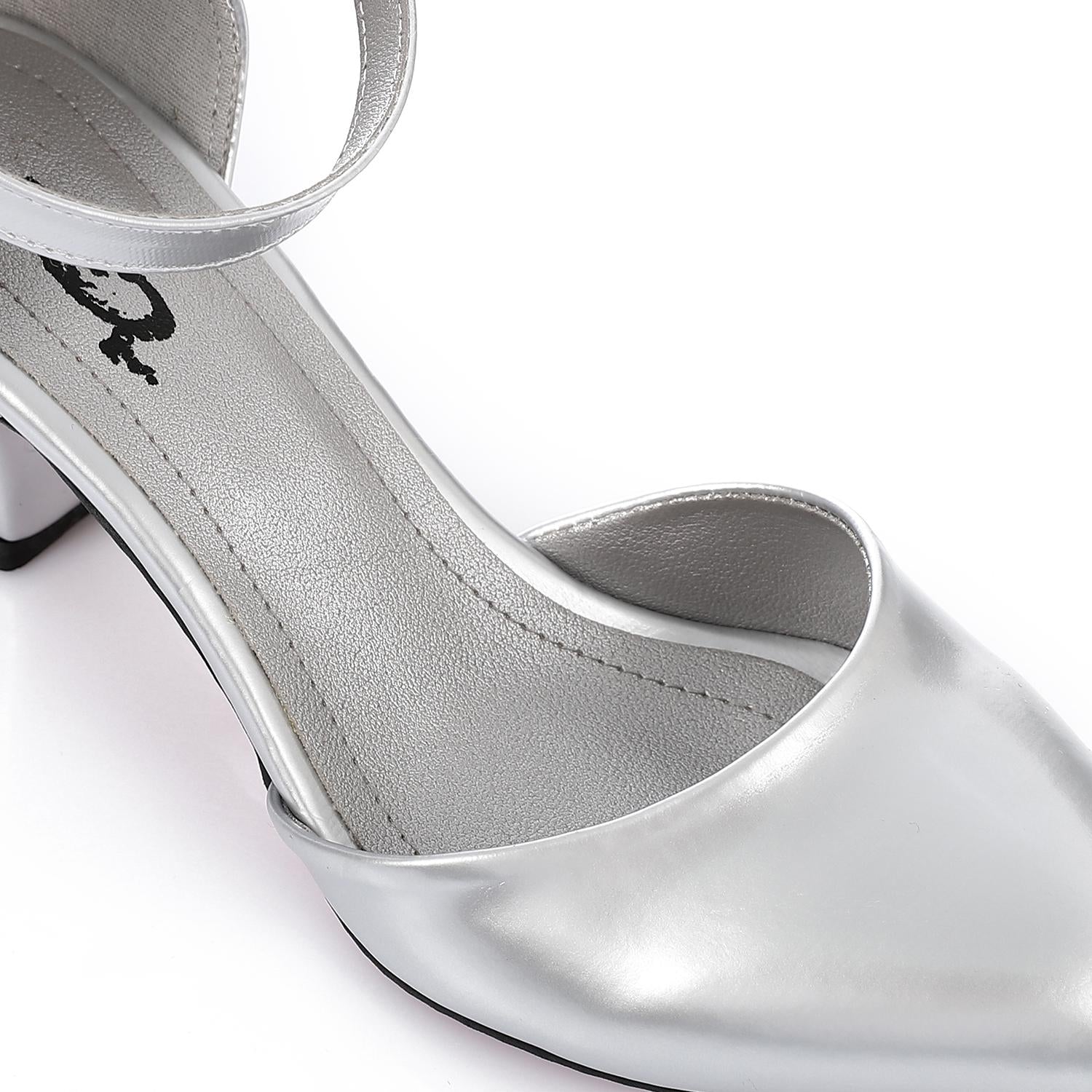 Key Features: Glossy silver finish, ankle strap for secure fit, stable block heel