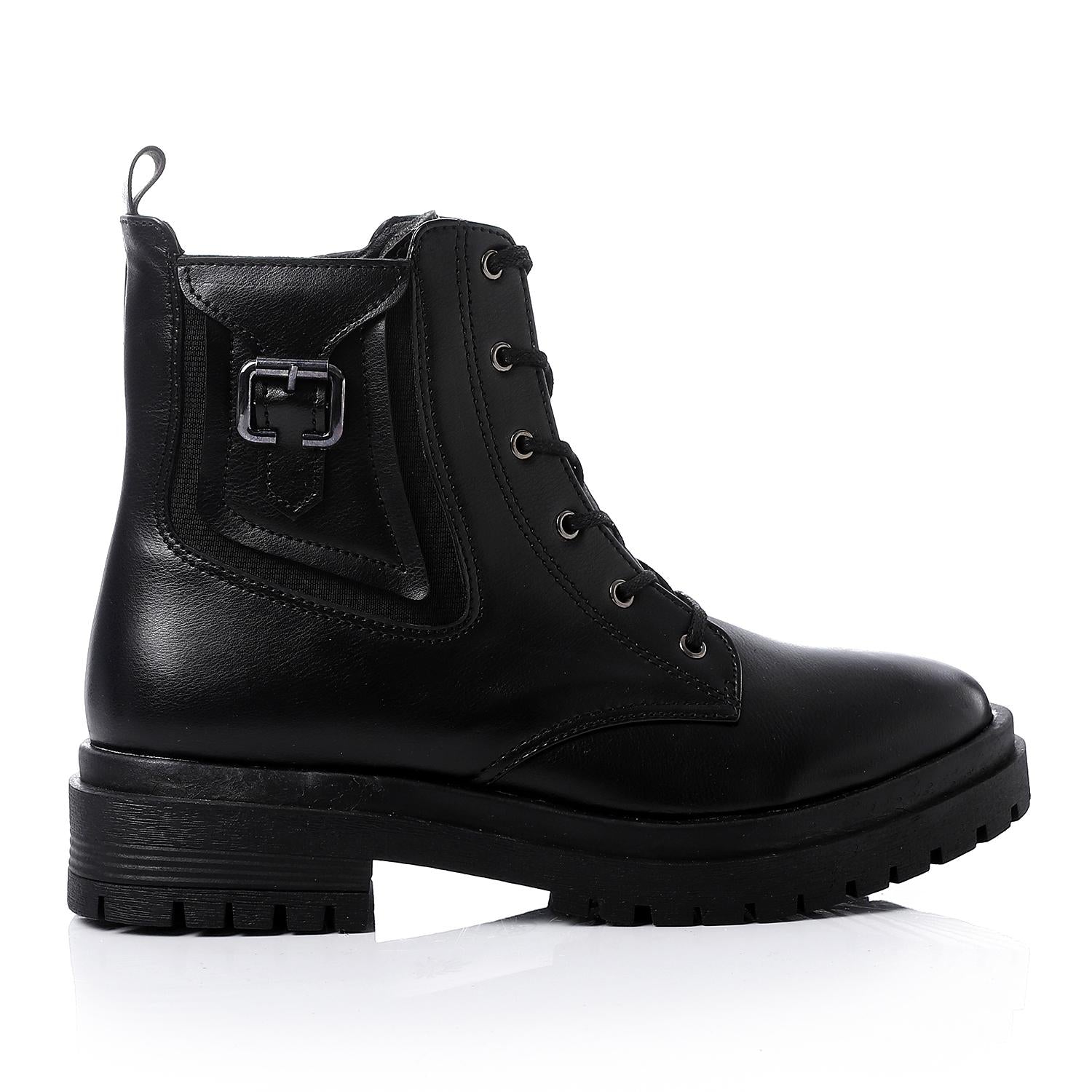 - Key Features: Smooth leather or faux leather finish for a classic look, decorative side buckle and strap for an edgy touch, dual closure with laces and zipper for convenience, and a chunky lug sole for traction and style
