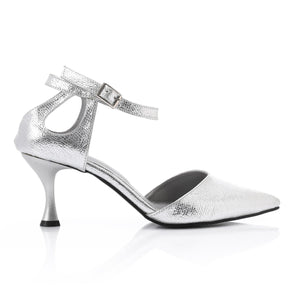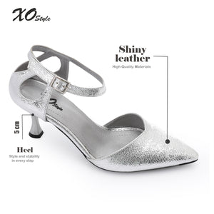 Key Features: Shiny metallic finish, supportive ankle strap, stable low kitten heel