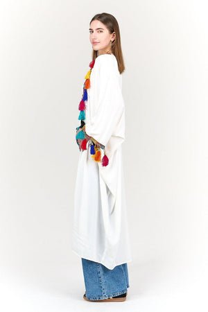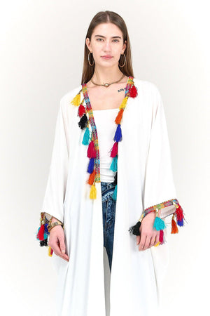 Embrace effortless style with this Tencel kimono, designed for a relaxed fit that offers both comfort and elegance. Crafted from soft, breathable Tencel, it features a solid pattern enhanced by playful colorful tassels, adding a vibrant touch to its minimalist design. The open neckline and long wide sleeves create a flowy, graceful silhouette, while the midi length makes it a versatile layering piece for any occasion. Designed in one size, it provides a flattering fit for all body types, making it an easy-to-wear essential for your wardrobe.