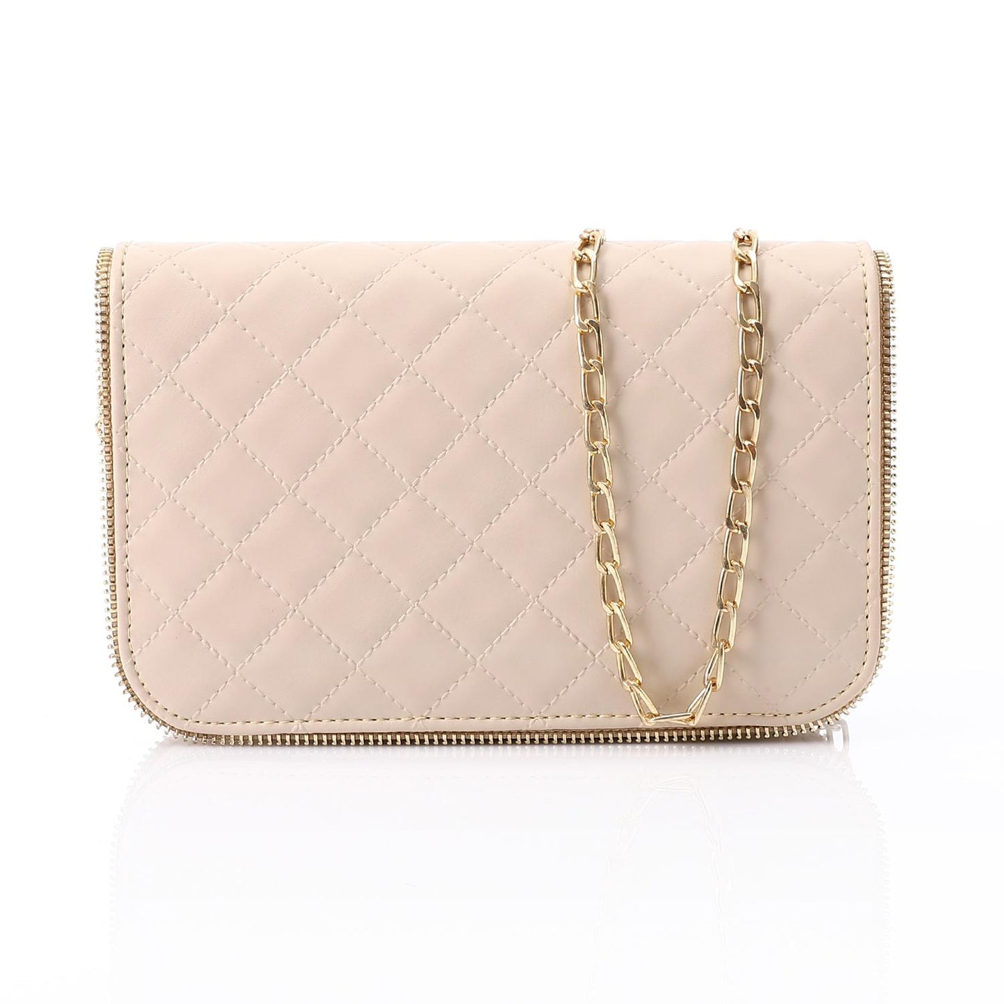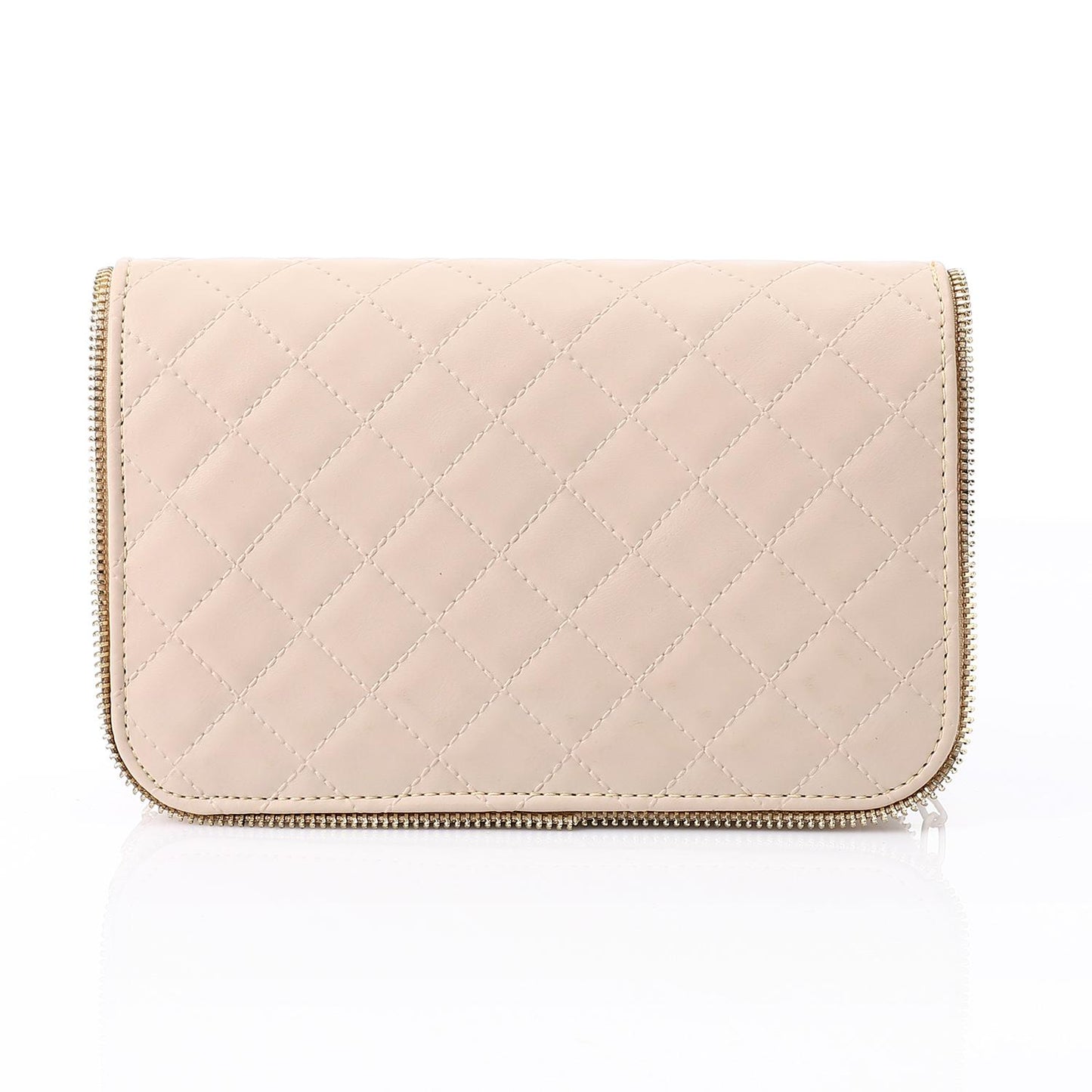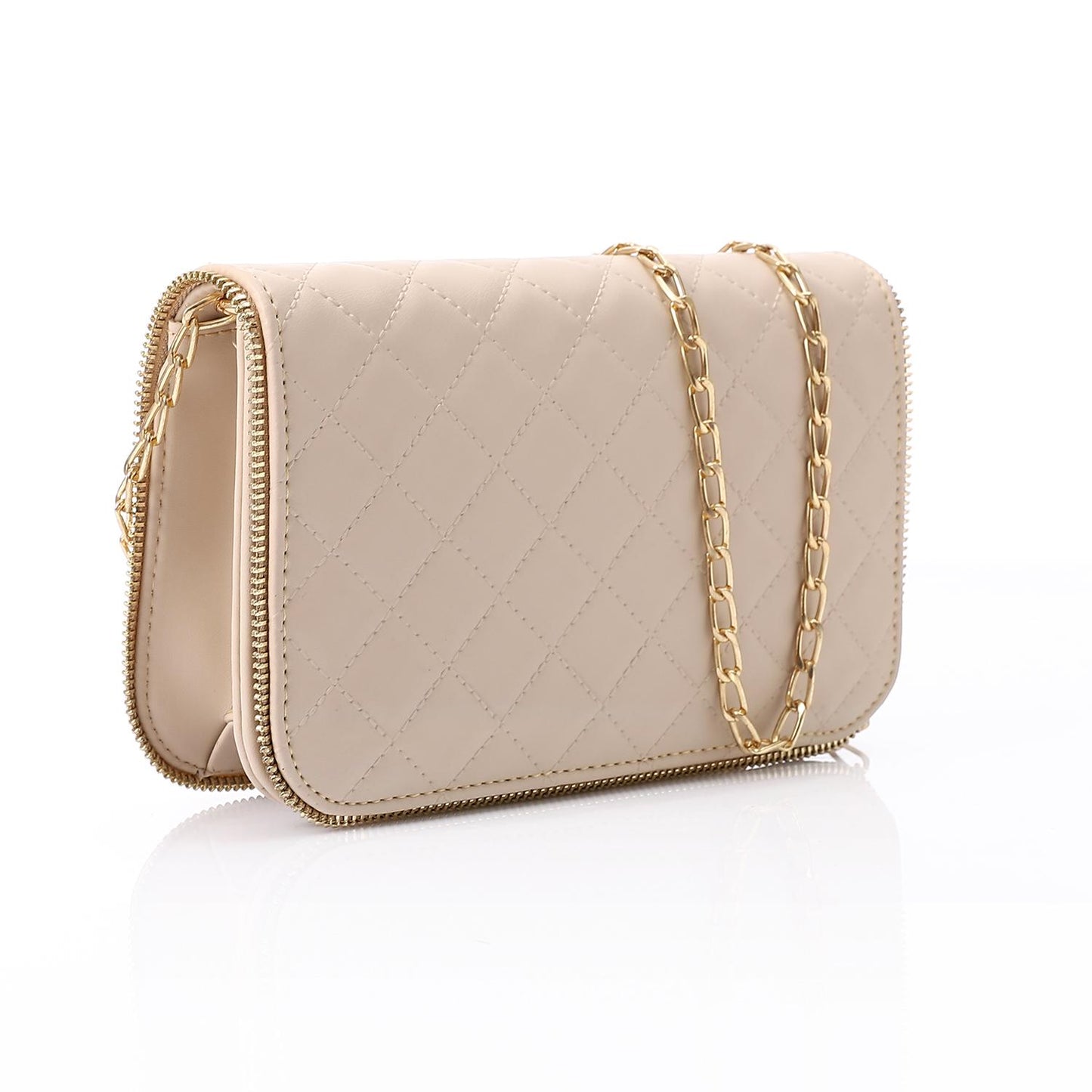 Unique Feature: Quilted zip-around design with detachable gold chain strap for dual styling (clutch or crossbody)