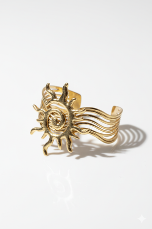 - Key Features: Durable zinc alloy with gold plating, unique sun design centerpiece for a radiant statement look, stylish open cuff with curved parallel lines for modern appeal