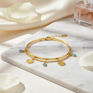 Stainless Steel Double Layer Evil Eye Charm Bracelet – Gold