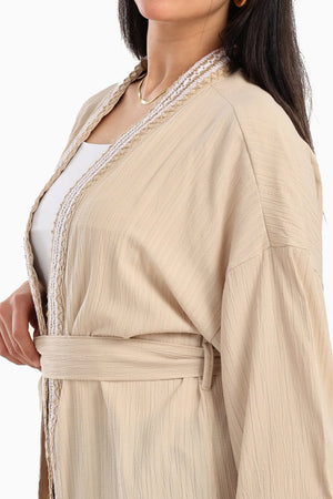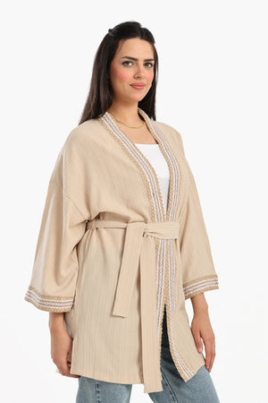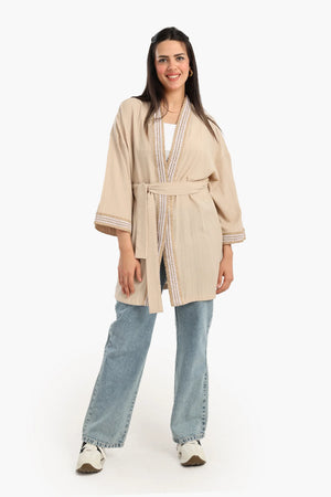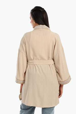 Designed with an open neckline and long sleeves, this kimono provides ease of movement while maintaining a polished look. The embroidered cuffs and hem bring an intricate, artistic touch, making it a standout piece. The hip-length cut and straight hem ensure a flattering silhouette, while the detachable waist belt allows you to customize your fit—whether left open for a flowy effect or cinched at the waist for a more structured appearance. Perfect for layering, this kimono is a versatile staple for both casual and sophisticated styling.