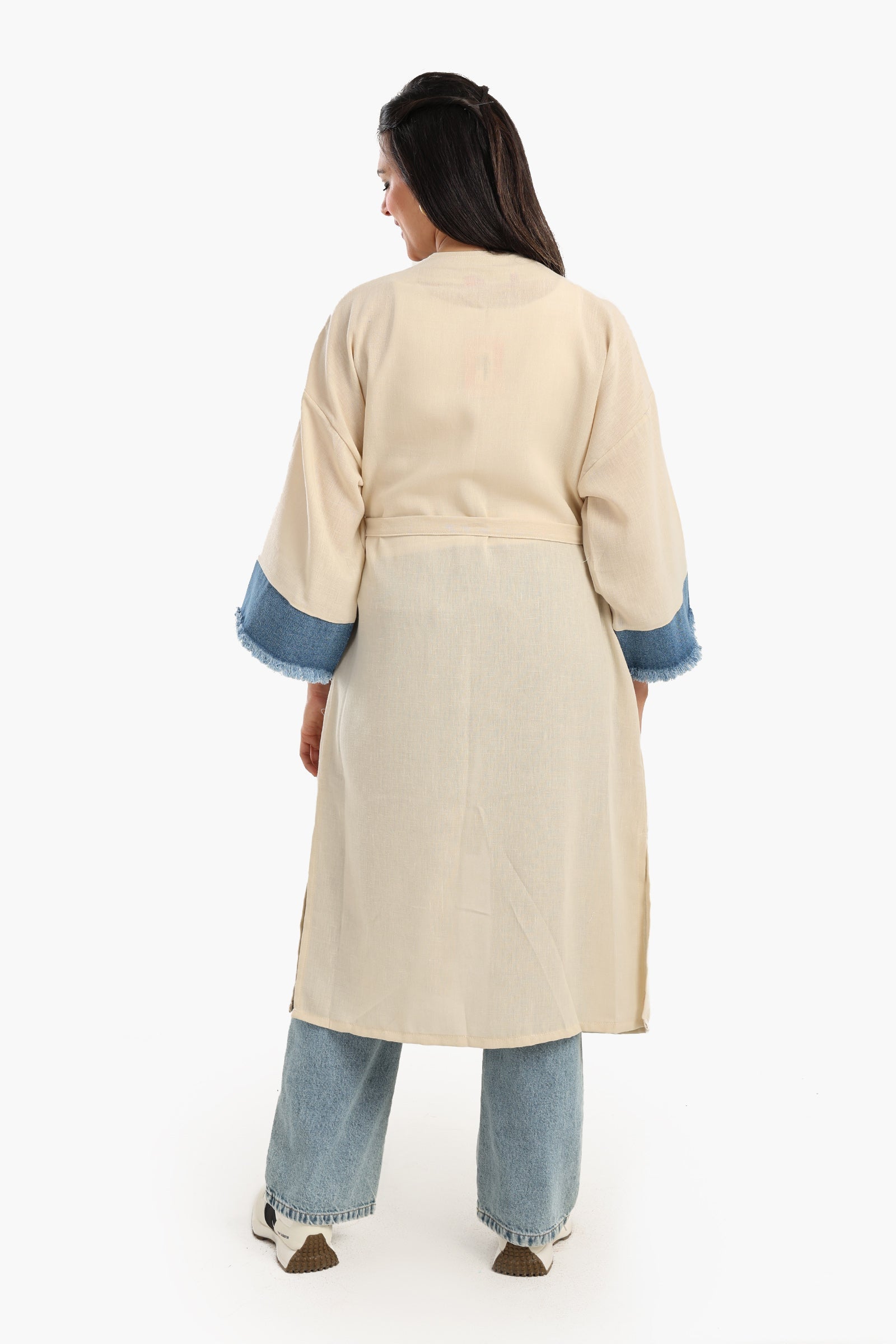 The Voile & Denim Contrast Kimono is a unique blend of effortless elegance and casual chic, perfect for layering. Crafted from lightweight voile and structured denim, this kimono offers a relaxed fit, ensuring both comfort and style. The solid pattern and open neckline create a sleek, versatile silhouette that drapes beautifully over any outfit. The long sleeves provide coverage, while the knee-length design enhances its flowing aesthetic. A standout feature is the two front denim pockets with an unfinished hem, adding a touch of contemporary edge. The detachable waist belt allows you to style it open for a breezy look or cinched for a more defined shape. Designed to be easy to wear, this kimono seamlessly transitions between casual and elevated styles.