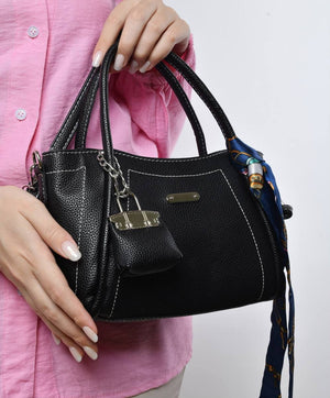 - Unique Feature: Contrast stitching, detachable decorative mini pouch with lock, colorful patterned scarf tied to handle
