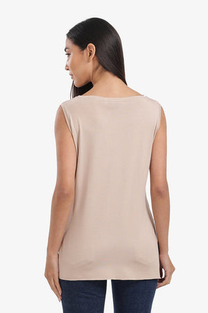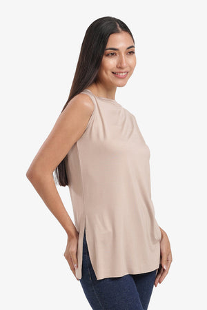 Boat Neck Sleeveless T-Shirt with Side Slits – Beige