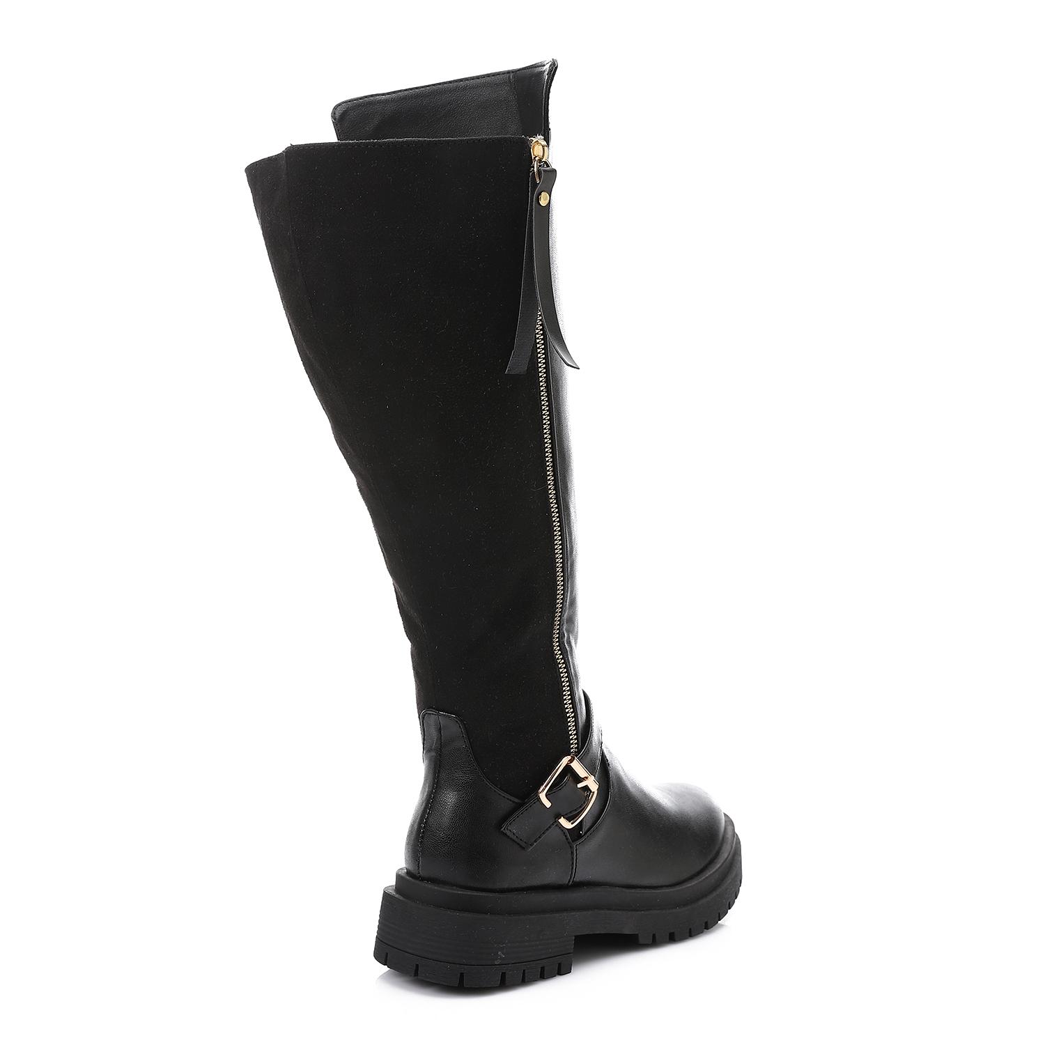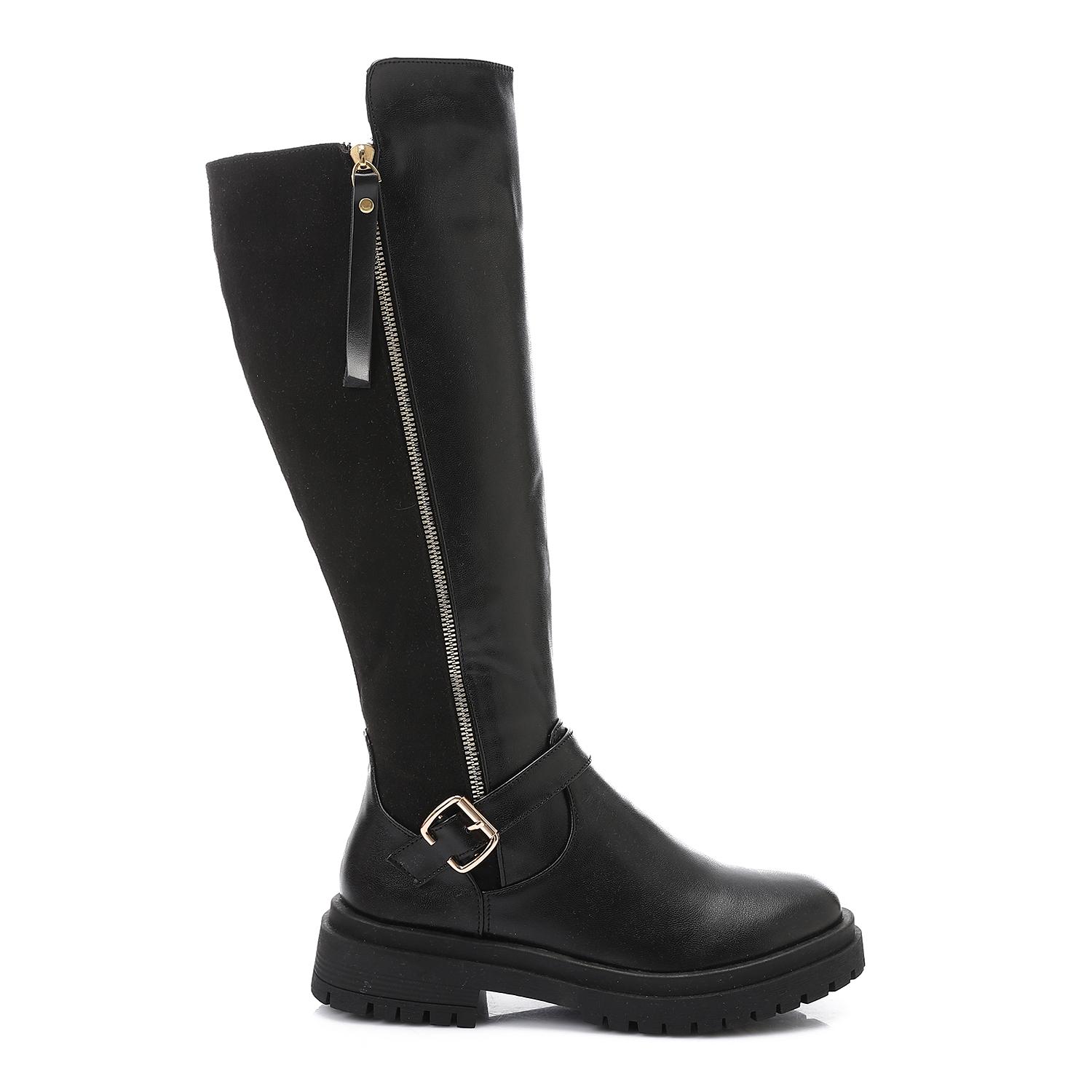 Buckle Detail Lug Sole Knee-High Boots – Black
