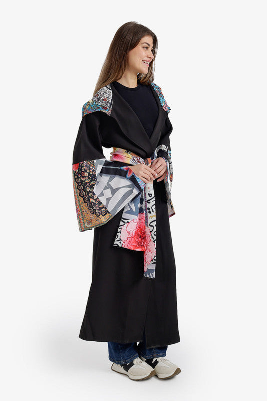 Contrast-Print Midi Kimono – Shawl Collar – Black
