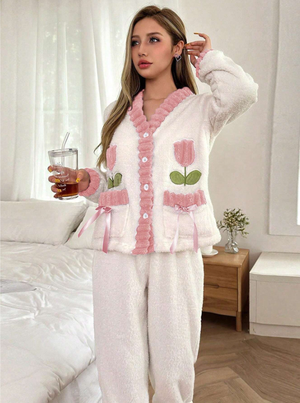 Pocket Bowknot Tulip Embroidery Contrast Trim Long Sleeve Top & Pants Fluffy Pajama Set For Women Cozy And Elegant Details, Fall Winter Clothes