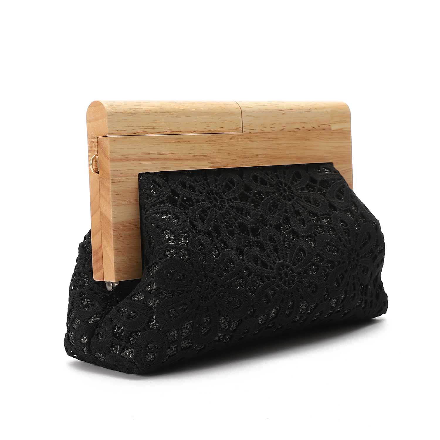 Crochet Floral Pattern Wooden Frame Clutch Shoulder Bag – Black