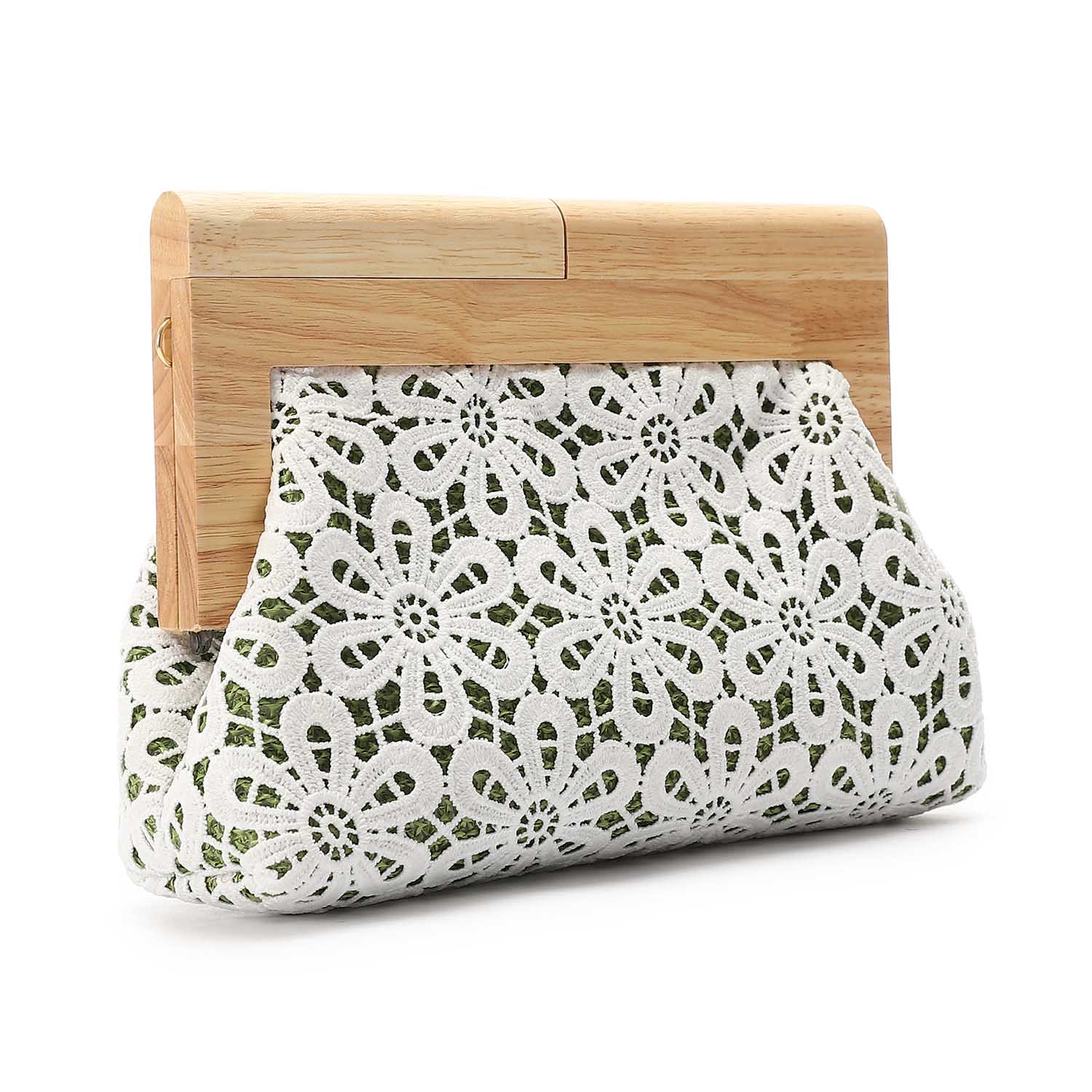 Crochet Floral Pattern Wooden Frame Clutch Shoulder Bag – Green