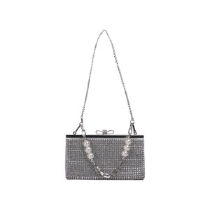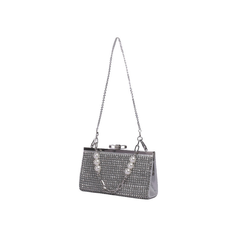 - Unique Feature: Pearl-embellished chain handle and crystal bow clasp