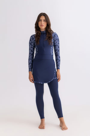 Top Design & Fit: Long-sleeve fitted swim top with contrast printed panels and attached modest skirt