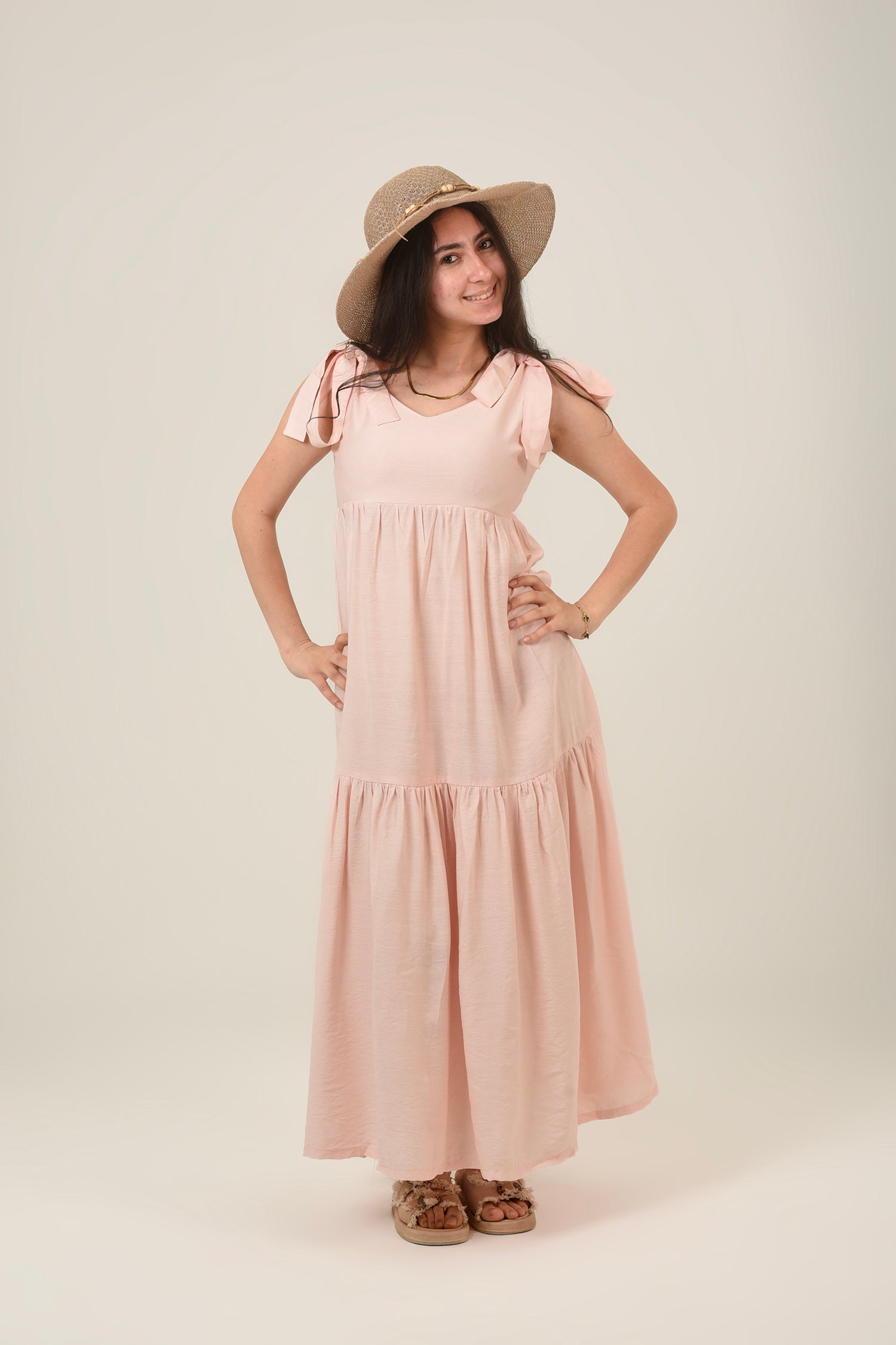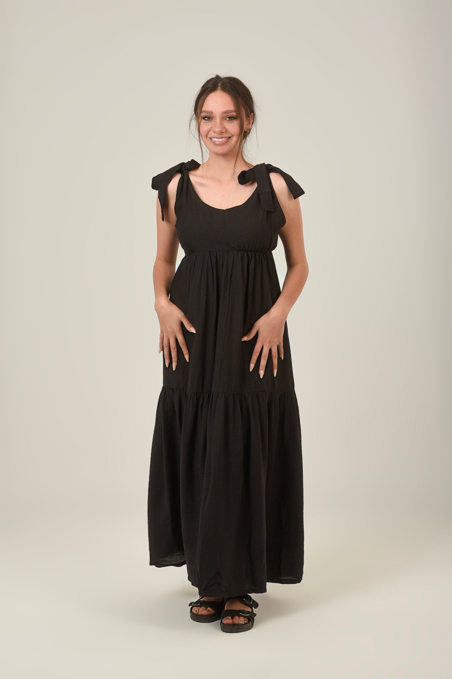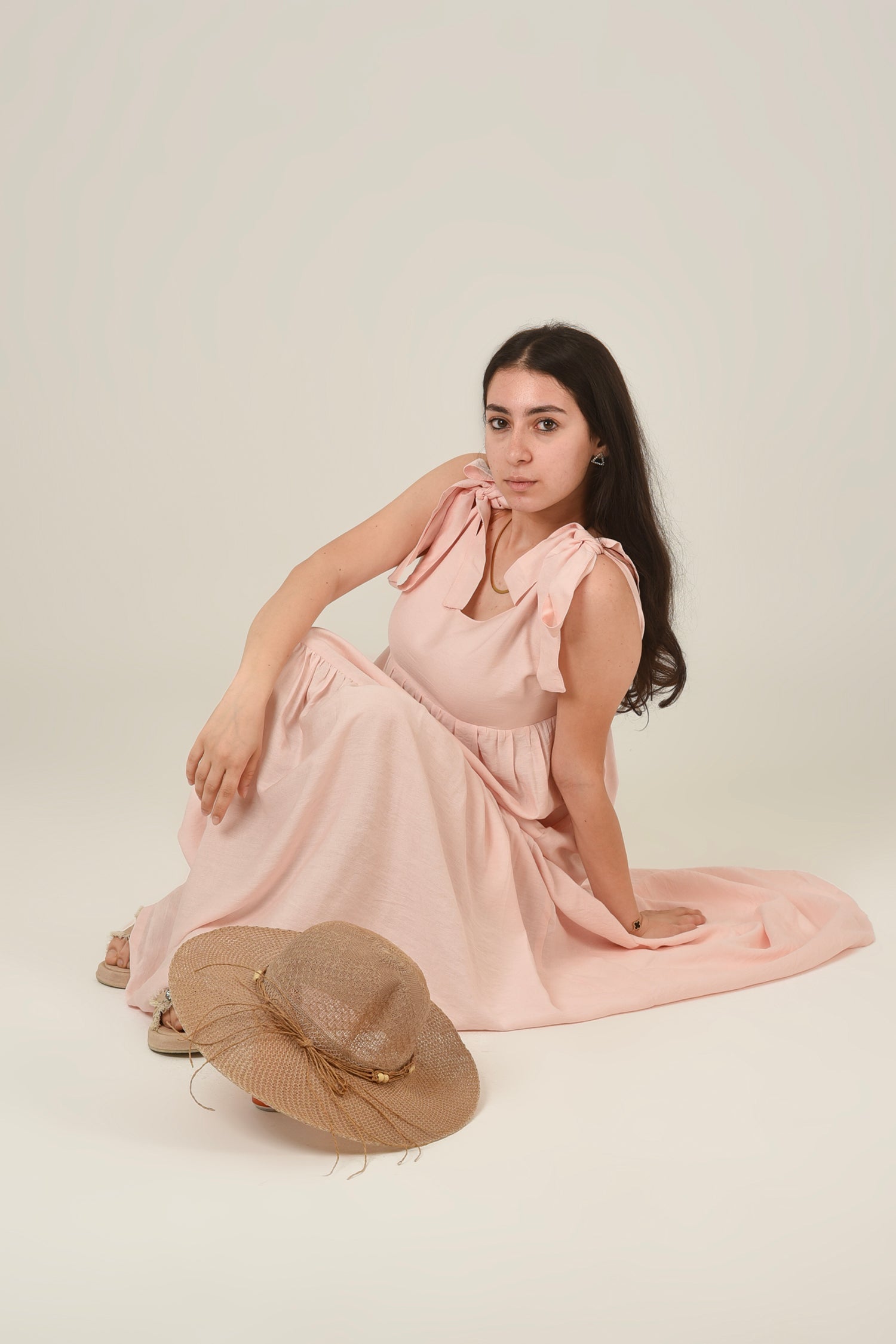 Linen Flare Flowy Tie Shoulders Maxi Dress